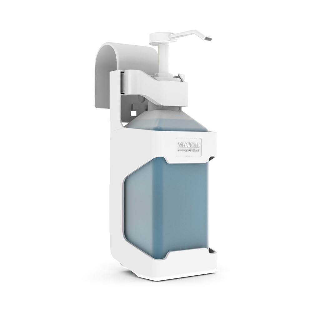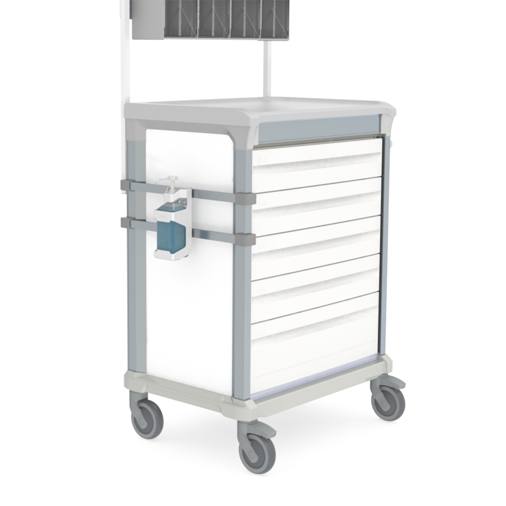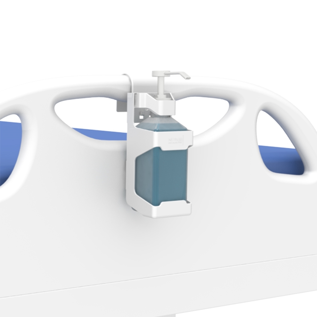 Notre support de distributeur de désinfectant à pompe et notre pompe à main rechargeable peuvent se fixer à des armoires et des cloisons ainsi qu'aux lits des patients. Pour en savoir plus, consultez le dépliant figurant à droite de cette page.