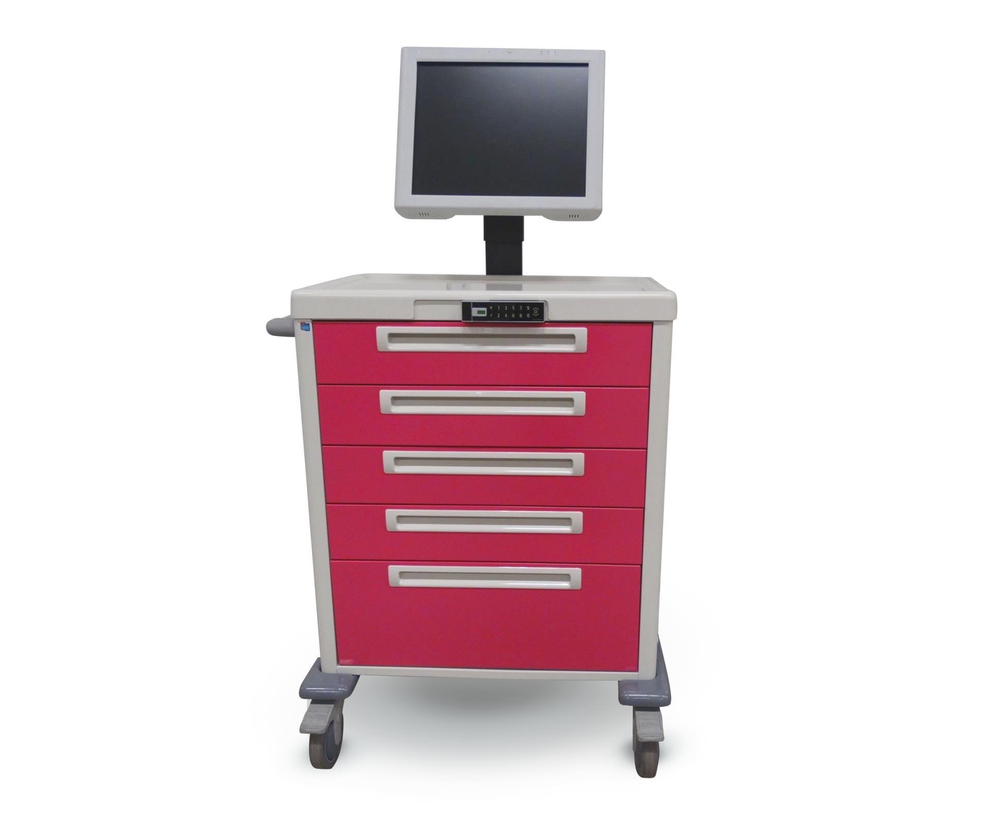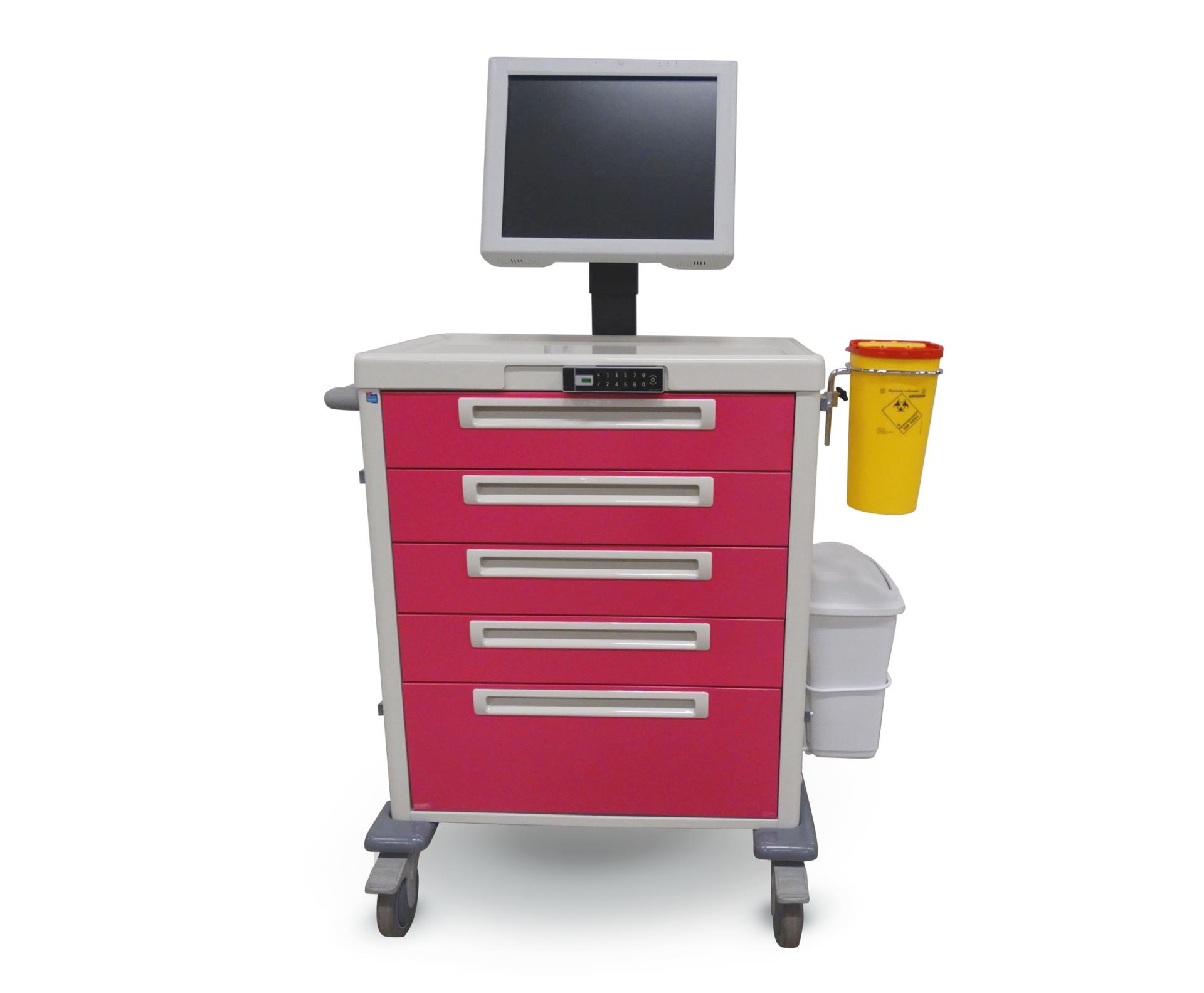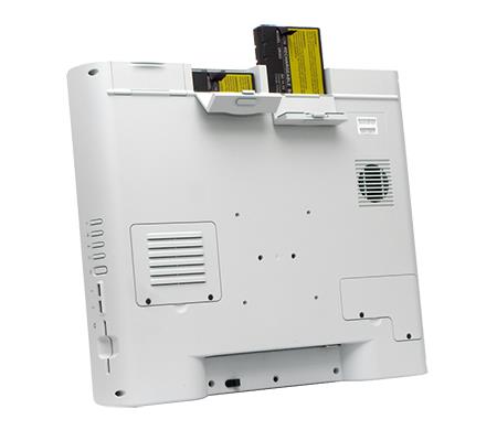 Nous proposons diverses solutions pour intégrer du matériel informatique sur nos chariots, notamment un ordinateur médical de 19”, 22” ou 24” avec revêtement antimicrobien. Des batteries (remplaçables) sont intégrées aux écrans afin d'assurer un fonctionnement autonome de 10 heures consécutives. Pas besoin de recharges intermédiaires. En outre, les batteries peuvent aisément être remplacées et/ou rechargées sur un point de chargement central ou via un cordon réseau disponible en option directement sur le chariot. Aucun pack de batterie supplémentaire n'étant nécessaire sur le chariot, cela fait la différence au niveau de l'espace à l'intérieur et à l'extérieur du chariot et offre un plus grand espace de stockage pour les médicaments ou les articles de consommation. Le chariot reste également plus léger et est donc plus facile à manœuvrer.