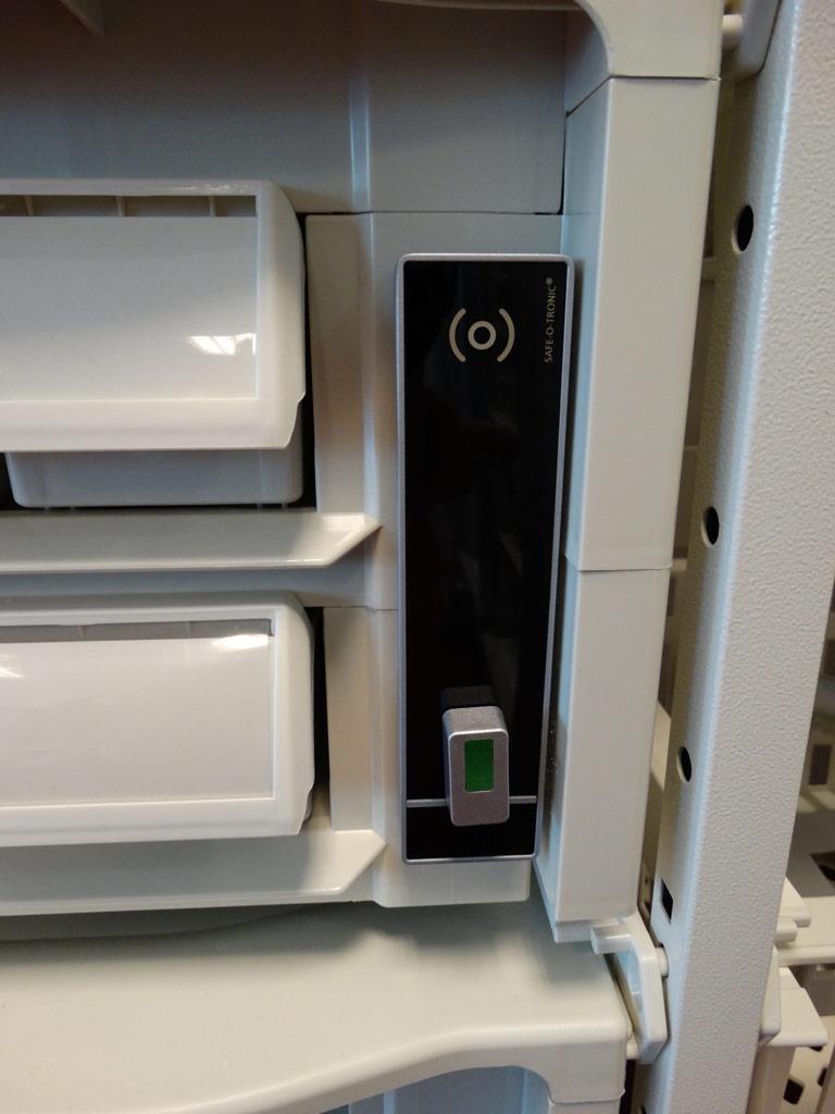 Les chariots modulaires à tiroirs en acier d'All Modul souvent employés peuvent satisfaire ces exigences d'accréditation. De par le caractère modulaire de ces chariots, ils sont parfaitement adaptés aux méthodes de travail courantes de la logistique médicale. Pour l'application de distribution des médicaments, nous avons doté la version standard du chariot à médicaments d'une mise à niveau astucieuse. Cette transformation spécifique permet l'ajout d'une solution de matériel informatique et d'une serrure RFID électronique.