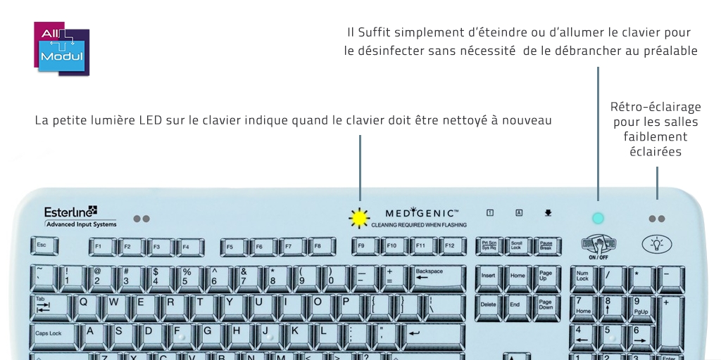 Le clavier médical par excellence qui a été développé pour les hôpitaux par un hôpital. Désinfecté en seulement quelques secondes et de nouveau prêt pour l’usage. Un système d’alerte de nettoyage rappelle au personnel de la nécessité d’un nettoyage, ce qui peut réduire la diffusion des bactéries de 94 %.