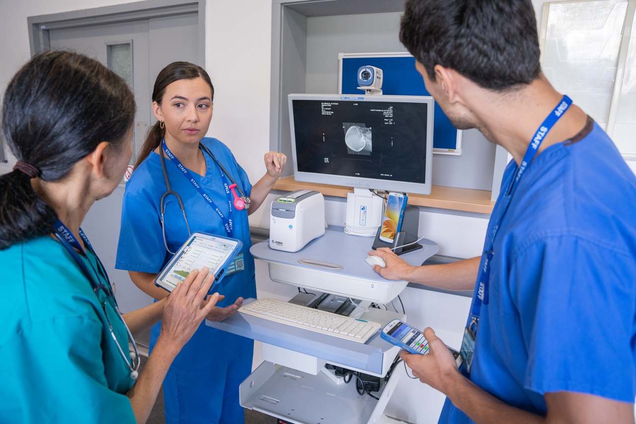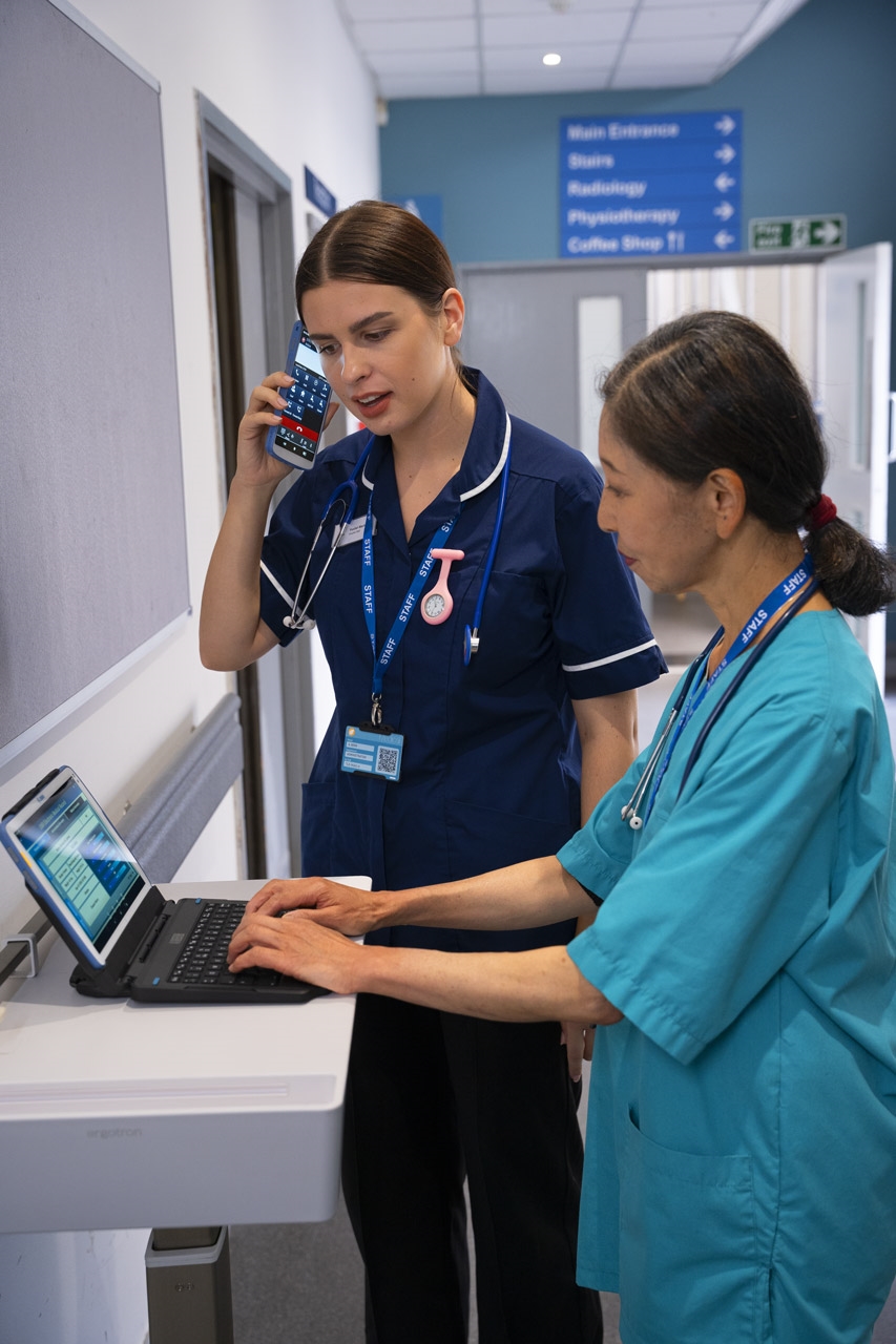 Le HC20 résiste à l’environnement intensif de la santé. Il est robuste et adapté à une désinfection régulière. Le grand écran tactile Full HD de 6 pouces fonctionne même avec des gants, ce qui permet au personnel de soins de travailler rapidement et en toute sécurité. Une simple pression sur le bouton d’urgence permet d’appeler immédiatement de l’aide, une fonction vitale pour le personnel comme pour les patients.