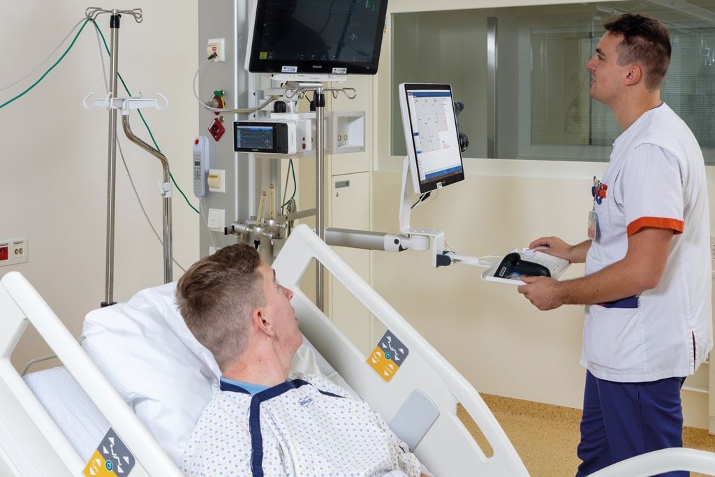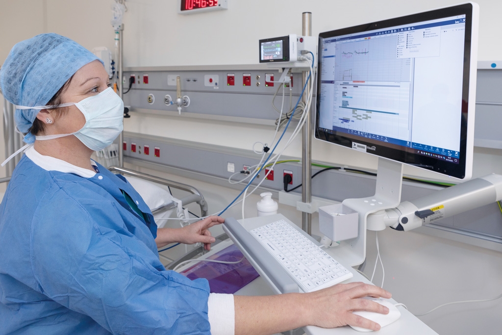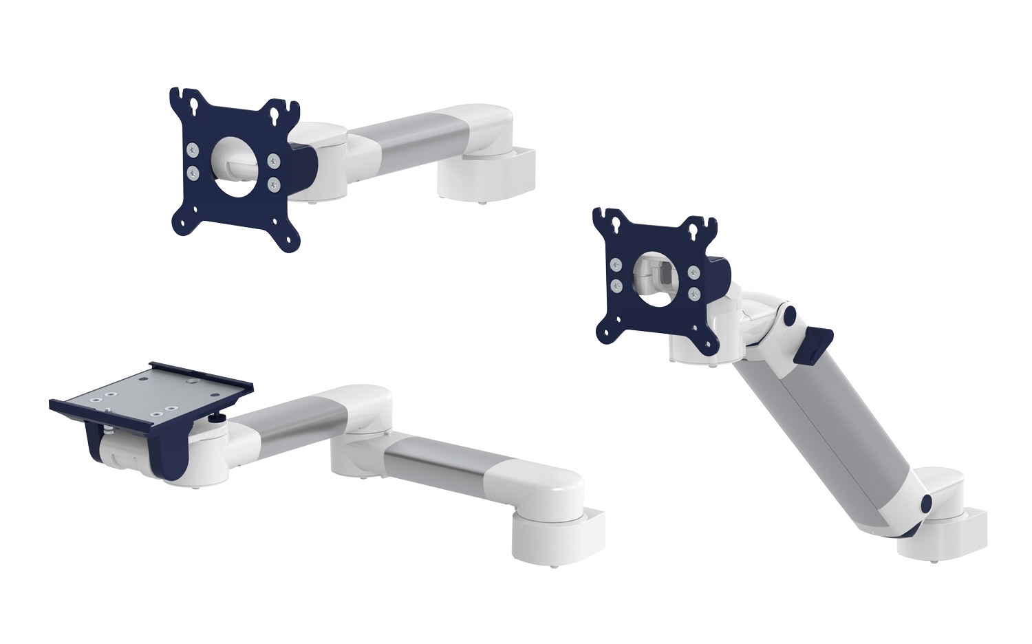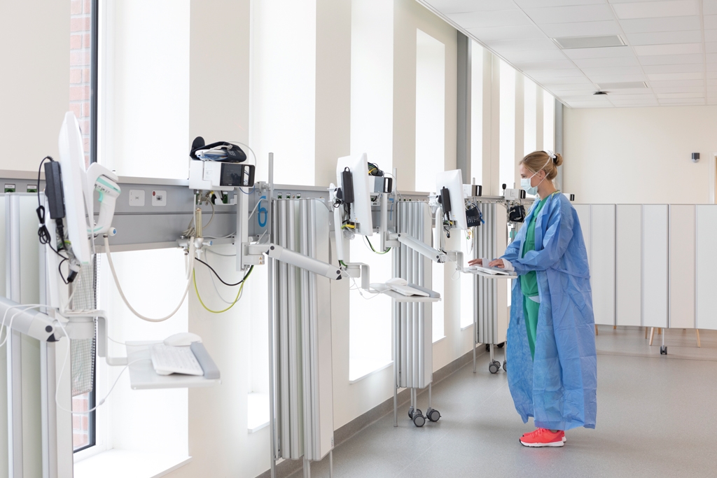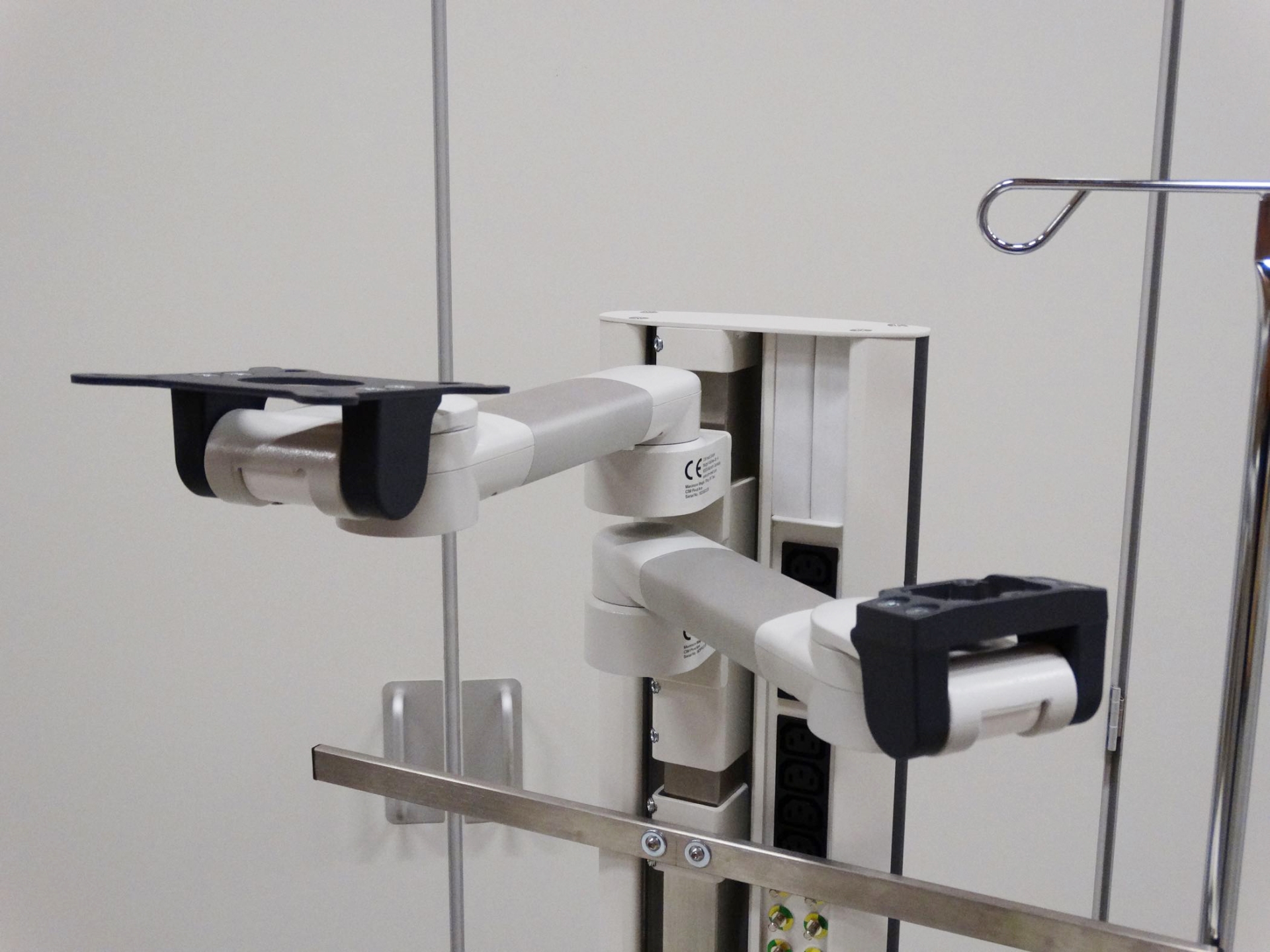 Sur les systèmes de support à câblage intégré CIM med, tous les câbles de l'appareil fixé sont installés de manière hygiénique et esthétique dans le boîtier des bras de support médicaux.