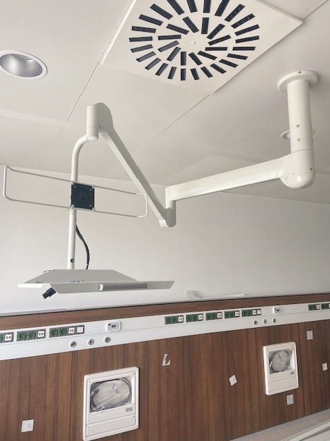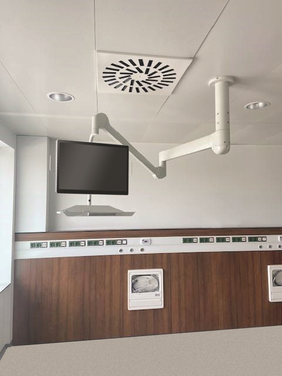 Pour le nouveau service de psychiatrie pédiatrique, le service SSR et la dialyse, qui compte 42 postes de dialyse, All Modul a installé des bras pour ordinateur médical DT524. Cet ordinateur tout-en-un est certifié EN60601-1 et possède une prise pour liaison équipotentielle. Le bras est équipé du DT524, un ordinateur médical étant nécessaire dans chaque espace de groupe 1 et de groupe 2. Les espaces à usage médical du groupe 1 et du groupe 2 sont soumis à des exigences de mise à la terre visant à limiter la tension de contact et ainsi le courant qui parcourt le corps humain. Les exigences liées au système de mise à la terre permettent de maintenir la tension de contact, et par conséquent le courant qui circule dans le corps, à une valeur admissible. Ces ordinateurs sont également utilisés dans les blocs opératoires et les services de soins intensifs.