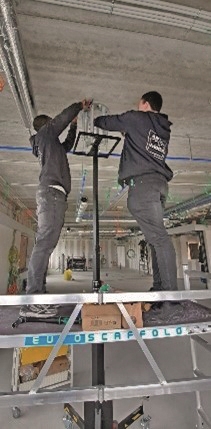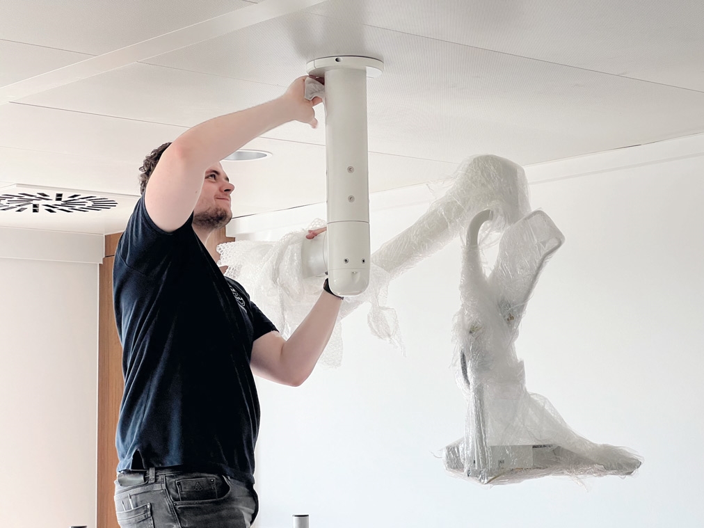 Pour son nouveau service de dialyse, l'Hôpital Jan Yperman d'Ypres a choisi un plafond climatique de la société Beddeleem. L'établissement AZ Delta Roeselare abrite quant à lui près d'un hectare de ces plafonds climatiques. Les dalles métalliques renferment un circuit de tuyaux en plastique dans lesquels de l'eau chaude circule en hiver et de l'eau froide en été. Cela ressemble à un système de chauffage au sol, mais installé au plafond. Cela permet d'éviter autant que possible les courants d'air dans le cadre de la climatisation/du chauffage de l'espace. En revanche, cela limite considérablement les possibilités d'accrocher des équipements au plafond. L'emplacement exact de chaque bras est indiqué à l'avance. La plafond climatique est alors construit autour. Dans ce cas particulier, les réducteurs (« supports ») sont installés en premier. Ils doivent être ajustés sur place du fait que la hauteur du plafond n'est pas la même partout. Outre ces « supports », des câbles électriques, des câbles LAN et des câbles de mise à la terre doivent traverser le bras. Ensuite, le plafond climatique est posé. Pour finir, les bras sont accrochés aux supports et les ordinateurs médicaux sont installés et branchés.