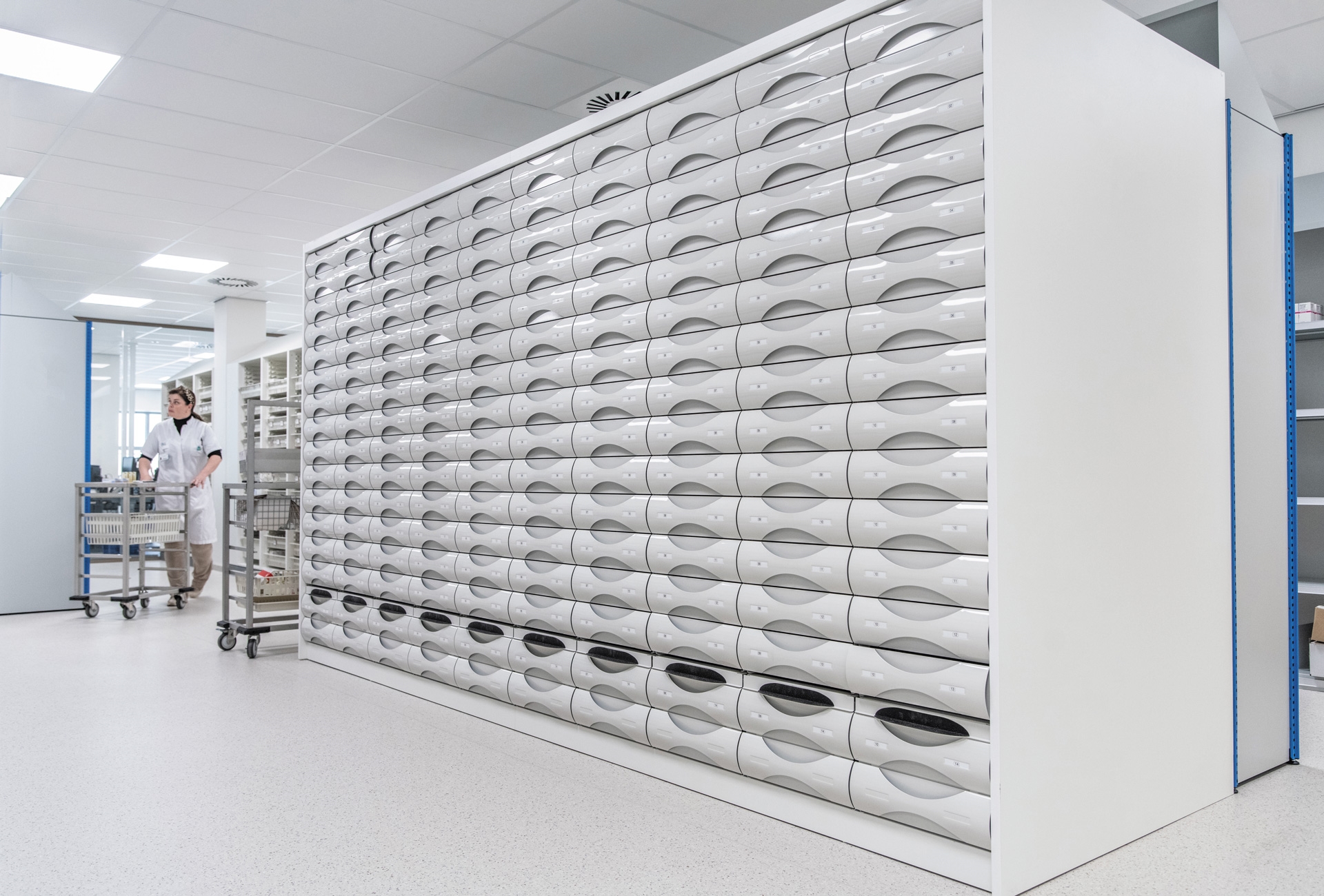 Les armoires à tiroirs représentent une solution efficace et sûre pour le stockage des médicaments dans les pharmacies (des hôpitaux). En effet, les pharmaciens des hôpitaux assument la lourde tâche de veiller à l'efficacité et la sécurité de la gestion des médicaments. Les tiroirs coulissants assurent un accès aisé aux médicaments, ce qui optimise le flux de travail. Parallèlement, les armoires offrent suffisamment d'espace de rangement et de possibilités d'organisation pour permettre aux pharmaciens de ranger et de trouver facilement les médicaments. En outre, les armoires à tiroirs facilitent le maintien de la bonne température et humidité, deux éléments essentiels à la stabilité des médicaments.