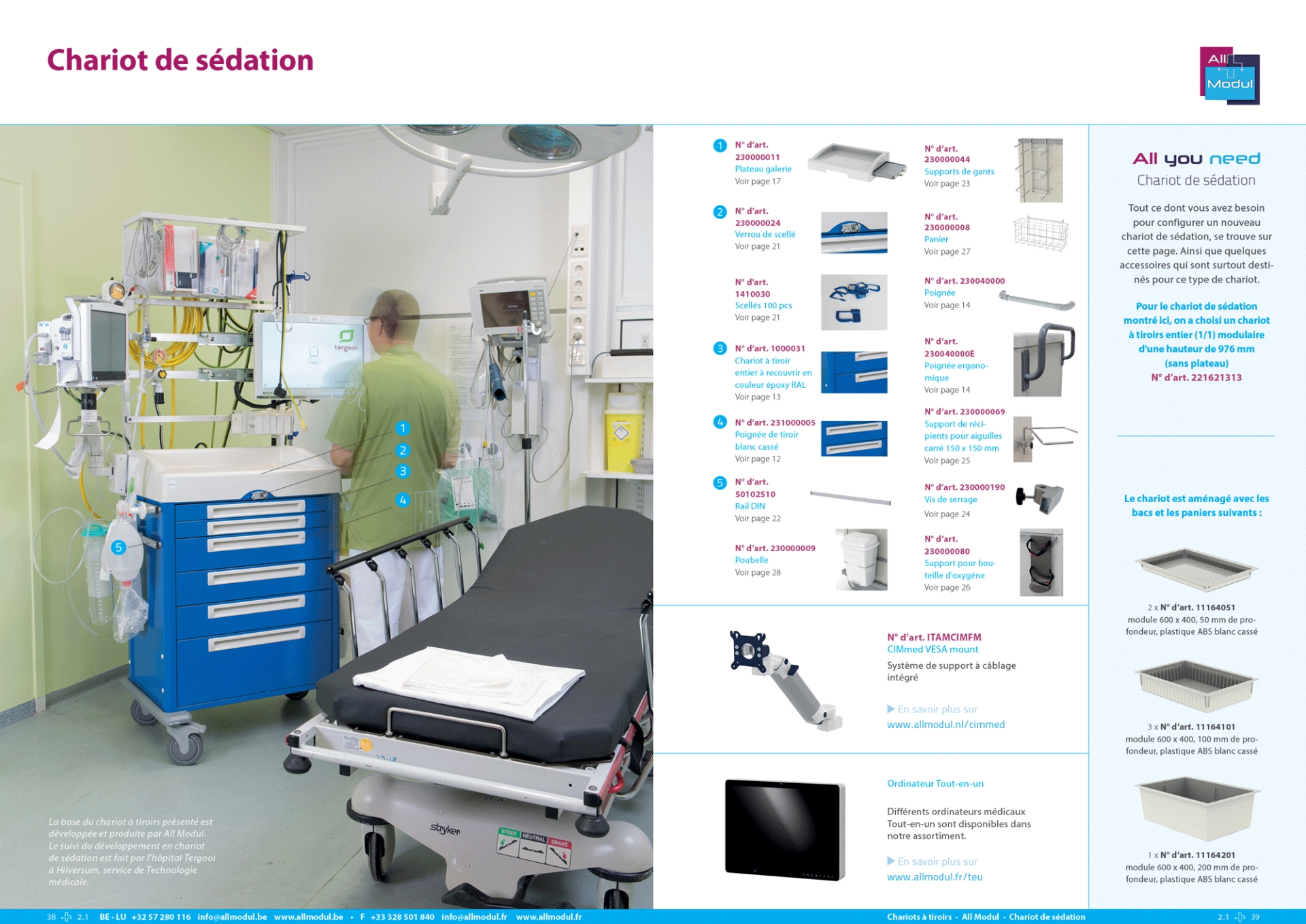 Vous êtes à la recherche d'un chariot pour la sédation dans votre hôpital ? Chez All Modul, vous pouvez composer votre chariot de sédation unique. Notre chariot à tiroirs en acier en constitue la base. Vous pouvez y ajouter des accessoires qui sont surtout destinés pour ce type de chariot. Pour le chariot de sédation montré ici, nous avons choisi un chariot à tiroirs entier (1/1) modulaire d'une hauteur de 976 mm (hors plateau). La base du chariot à tiroirs présenté est développée et produite par All Modul. Le suivi du développement en chariot de sédation est fait par l'hôpital Tergooi à Hilversum, service de Technologie médicale.