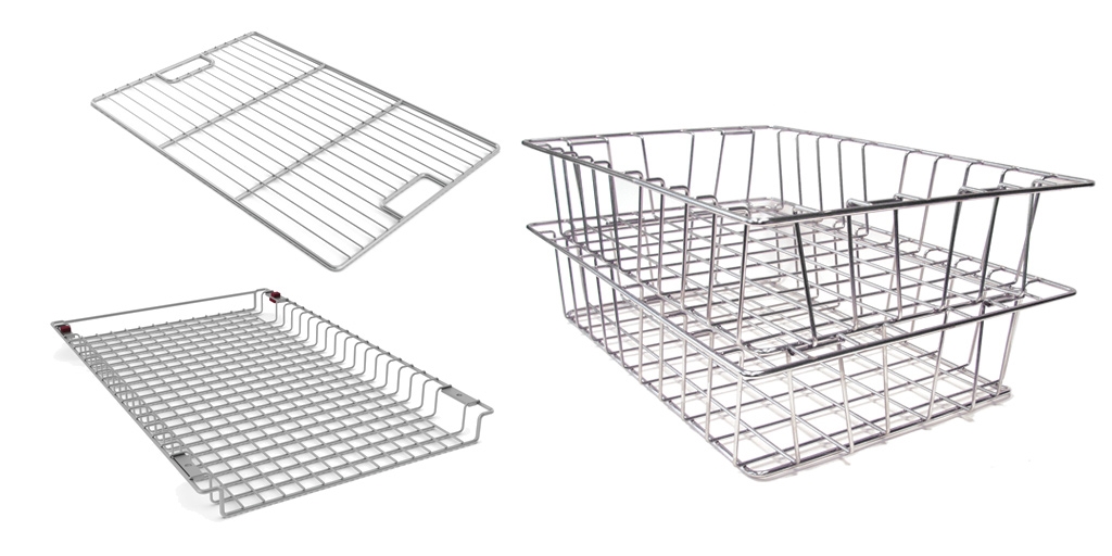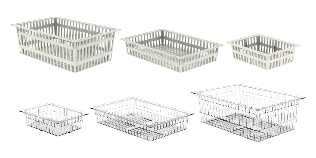 Pour les modules, nous opérons une distinction entre les paniers en plastique, grillagés et en acier inoxydable. Pour ce qui est des dimensions, des modules entiers et demis sont possibles, avec des dimensions de 600x400 mm et 300x400 mm. Ces paniers existent en cinq hauteurs différentes : 15, 50, 100, 150 et 200 mm.