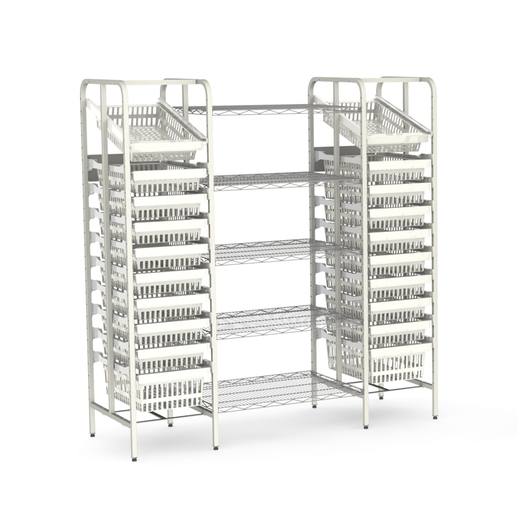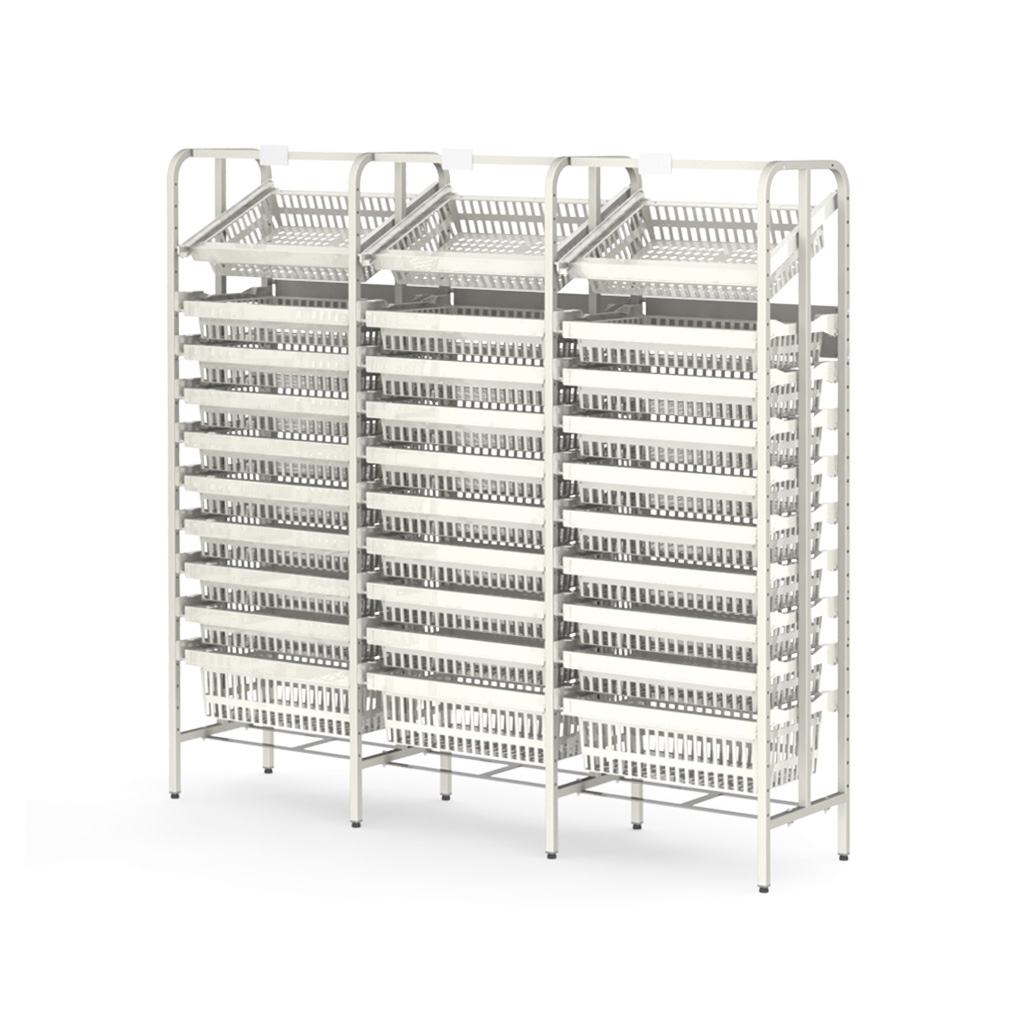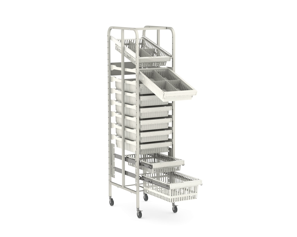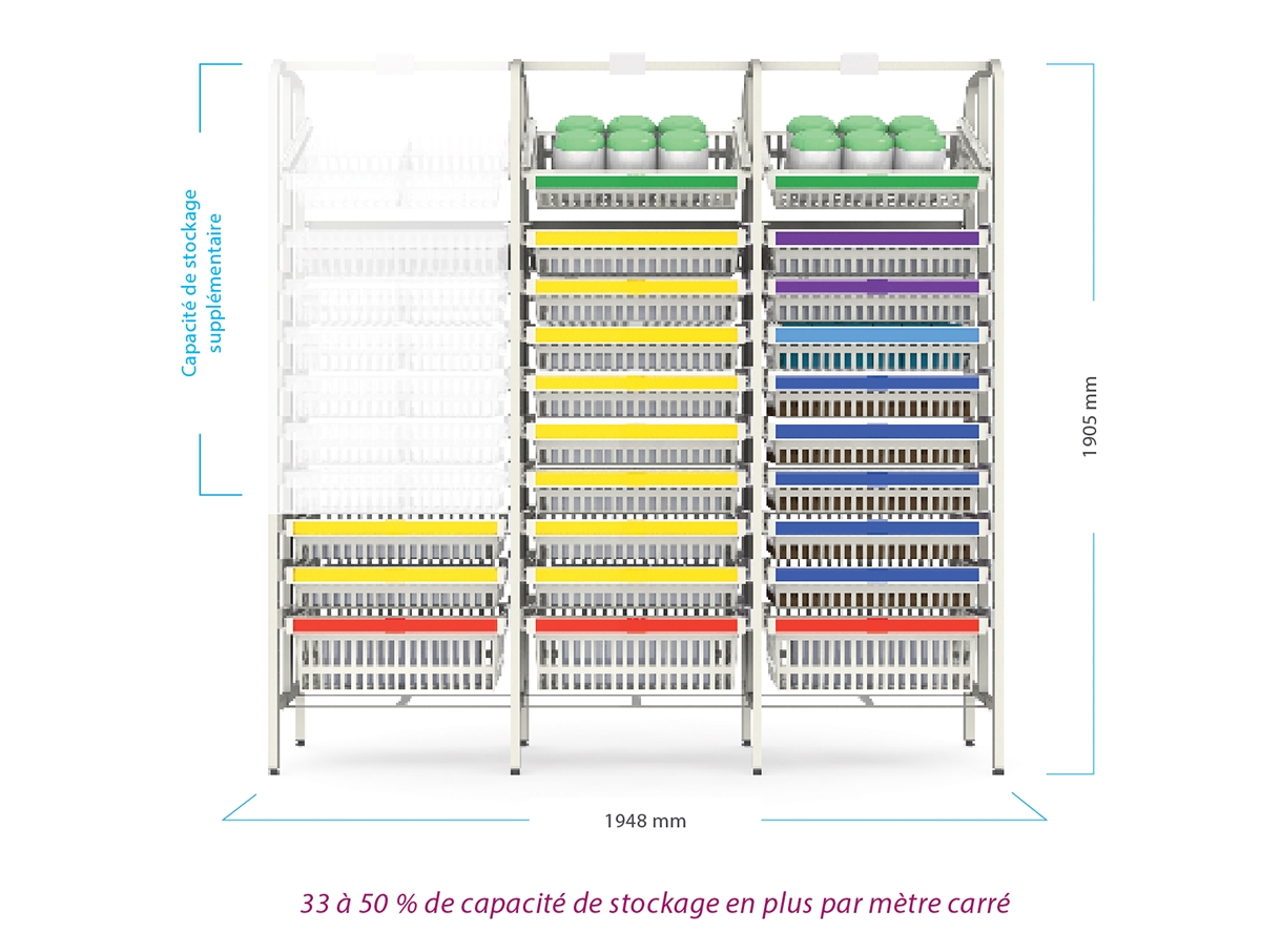 Les modules et les paniers peuvent être rangés horizontalement ou en diagonale et sont basculés pendant l’utilisation. L’utilisateur travaille de façon parfaitement ergonomique.