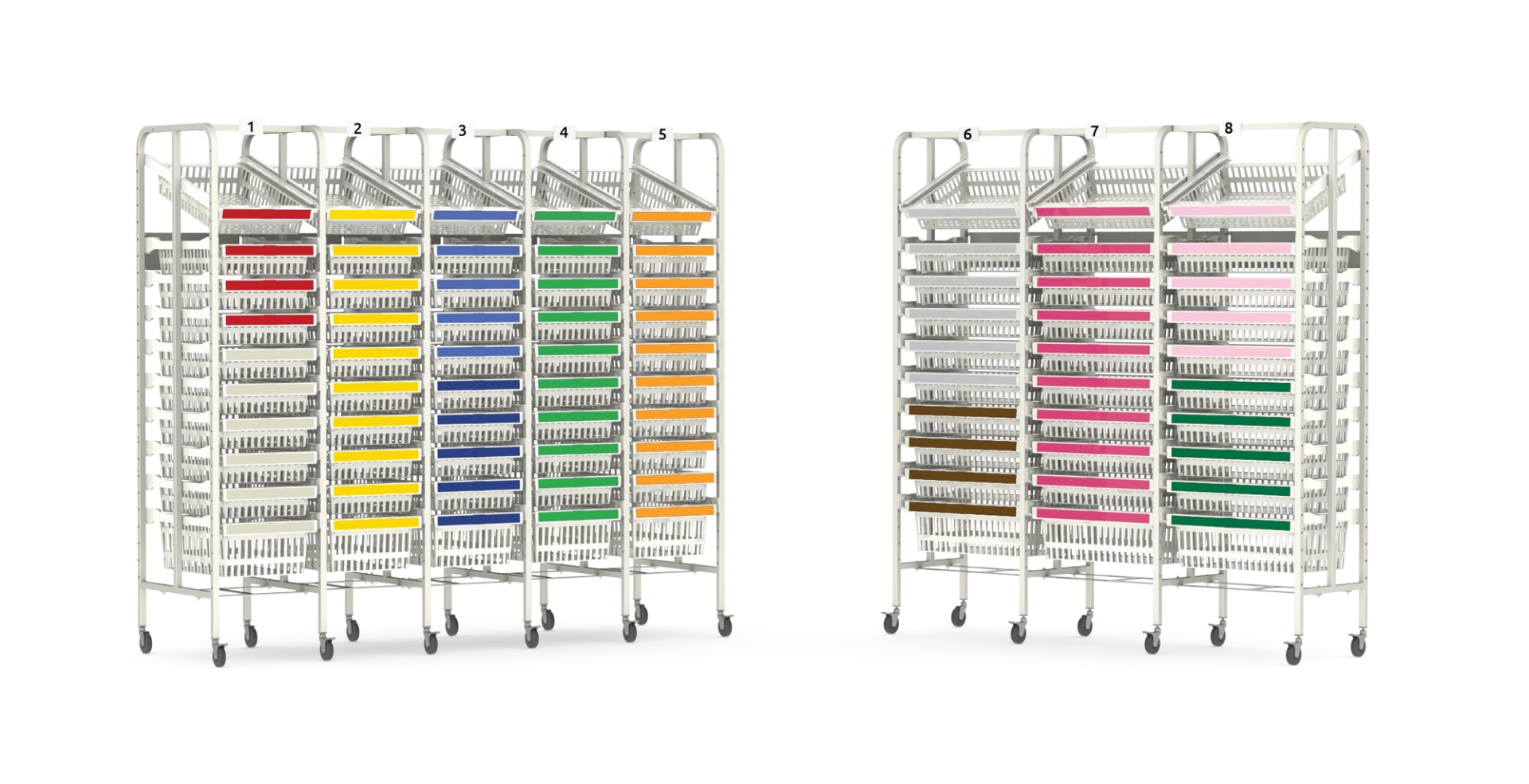 Pour localiser rapidement et aisément les stocks, nous recommandons de les catégoriser. L’attribution à chaque catégorie d’un code couleur unique accroît la visibilité et l’efficacité. Des poignées à étiquettes en option peuvent être fixées aux modules et aux paniers. On peut y apposer des bandes de couleurs différentes afin de faciliter la recherche des stocks. Plus d'informations sur étiquetage.