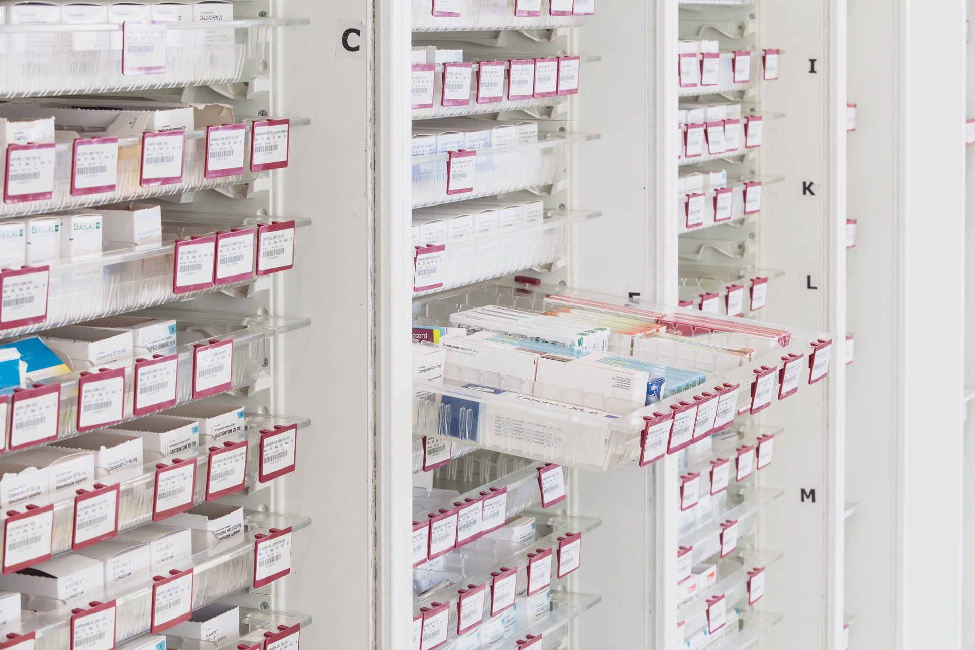 La diversité des systèmes de distribution de médicaments est colossale. Il en va de même pour les possibilités d'aménagement intérieur et de systèmes de fermeture des armoires à médicaments All Modul. Que vous utilisiez un système EAV, EAG, vide-plein ou des cases de division, l'intérieur peut être équipé d'étagères fixes ou d'étagères télescopiques, sans oublier les étagères à médicaments divisées, les cassettes à médicaments et les systèmes de modules. Des coffres et tiroirs à stupéfiants peuvent aisément être intégrés, tout comme un éclairage, une signalisation et des systèmes de serrure.