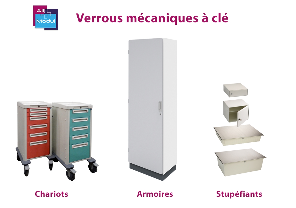 All Modul offre différentes possibilités pour protéger mécaniquement, aussi bien que de manière électronique, l'accès aux chariots à pansements, aux armoires de laboratoire, à médicaments, à documents et à vêtements, aux casiers et boîtes aux lettres internes. Les différentes sortes de verrouillage qu'offre All Modul peuvent s'appliquer à nos armoires, chariots et nombre d'autres accessoires modulaires et en lien avec la médecine.